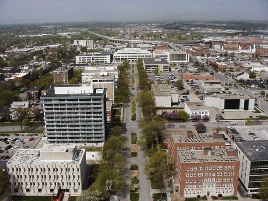 The Department of Labor is one of several buildings surrounding the Capitol which house state agencies. Lincoln High School, the city’s first high school, is at the intersection of J Street and Capitol Parkway. The tree canopy at Woods Park is seen in the middle of the image. Growth in Lincoln was originally to the east, but recently has expanded in all directions